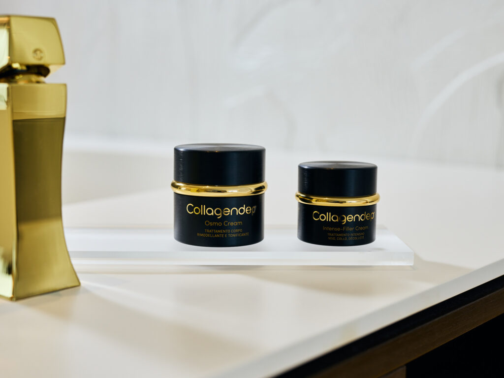 I cosmeceutici Collagendep sono racchiusi in un packaging esclusivo, realizzato in vetro opale, per preservare la stabilità delle formule. Il rivestimento in alluminio nero opaco con finitura spazzolata e dettagli oro conferisce un’eleganza senza tempo. Ogni elemento riflette l’essenza del brand: raffinatezza, protezione e cura dei dettagli.