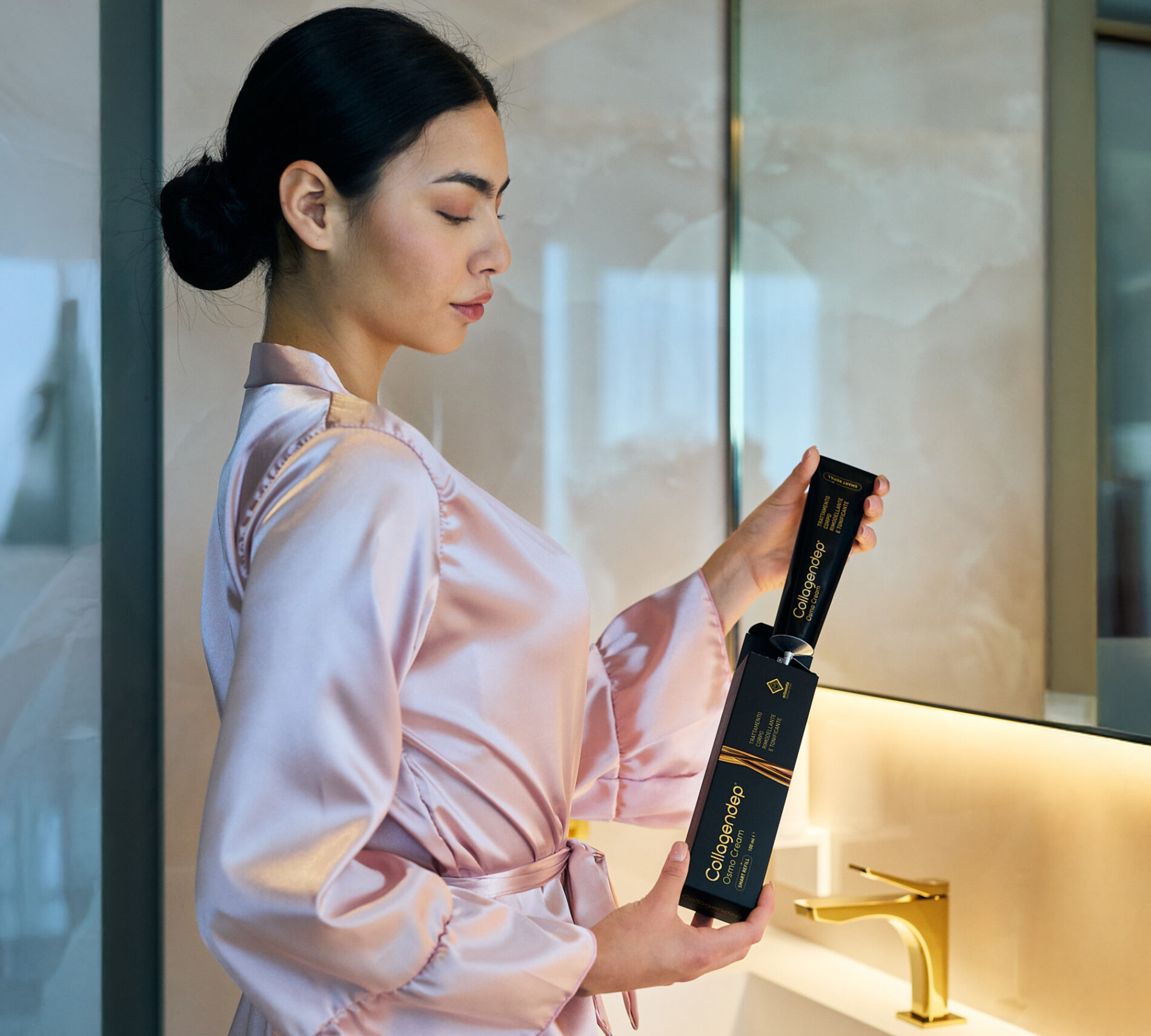 I cosmeceutici Collagendep sono racchiusi in un packaging esclusivo, realizzato in vetro opale, per preservare la stabilità delle formule. Il rivestimento in alluminio nero opaco con finitura spazzolata e dettagli oro conferisce un’eleganza senza tempo. Ogni elemento riflette l’essenza del brand: raffinatezza, protezione e cura dei dettagli.
